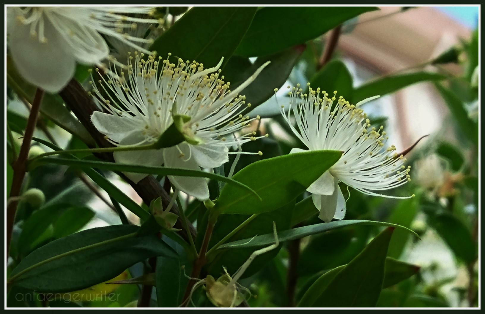 İlk kez görüp peyzaj bitkisi sandığım bu şık bitki Avustralya'ya özgü bir çalı ya da ağaç türü çıkmaz mı? Mızrak şeklindeki yaprakları ezildiğinde aromatik olup 3-25 beyaz çiçekten oluşan salkımlar sonbaharda olgunlaşan ve yaban mersini türünden pembe, uzun, yenilebilir meyvelere dönüşüyormuş. 😲